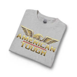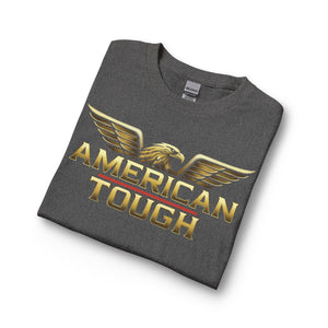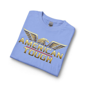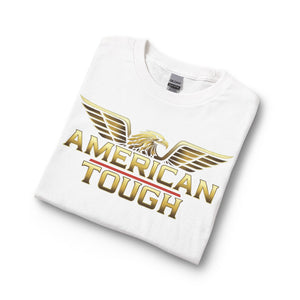 This long-sleeve shirt carries a bold, patriotic energy with a gold-toned “AMERICAN TOUGH” emblem and soaring eagle wings across the chest. The heavyweight graphic reads confident without shouting, built to sit cleanly on a classic-cut silhouette. Wear it for crisp mornings, garage projects, or neighborhood meetups — it layers easily under a jacket or stands strong on its own. The cotton feels substantial and smooth, and the ribbed collar and cuffs keep the lines neat after repeated wear. It’s for people who like simple, straightforward style with an unmistakable attitude.