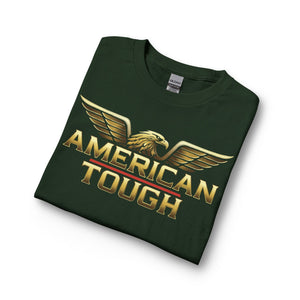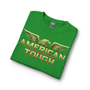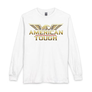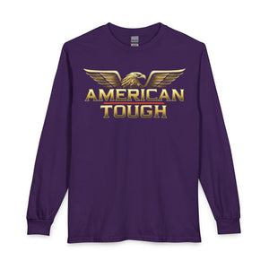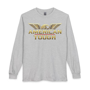 This long-sleeve shirt carries a bold, patriotic energy with a gold-toned “AMERICAN TOUGH” emblem and soaring eagle wings across the chest. The heavyweight graphic reads confident without shouting, built to sit cleanly on a classic-cut silhouette. Wear it for crisp mornings, garage projects, or neighborhood meetups — it layers easily under a jacket or stands strong on its own. The cotton feels substantial and smooth, and the ribbed collar and cuffs keep the lines neat after repeated wear. It’s for people who like simple, straightforward style with an unmistakable attitude.